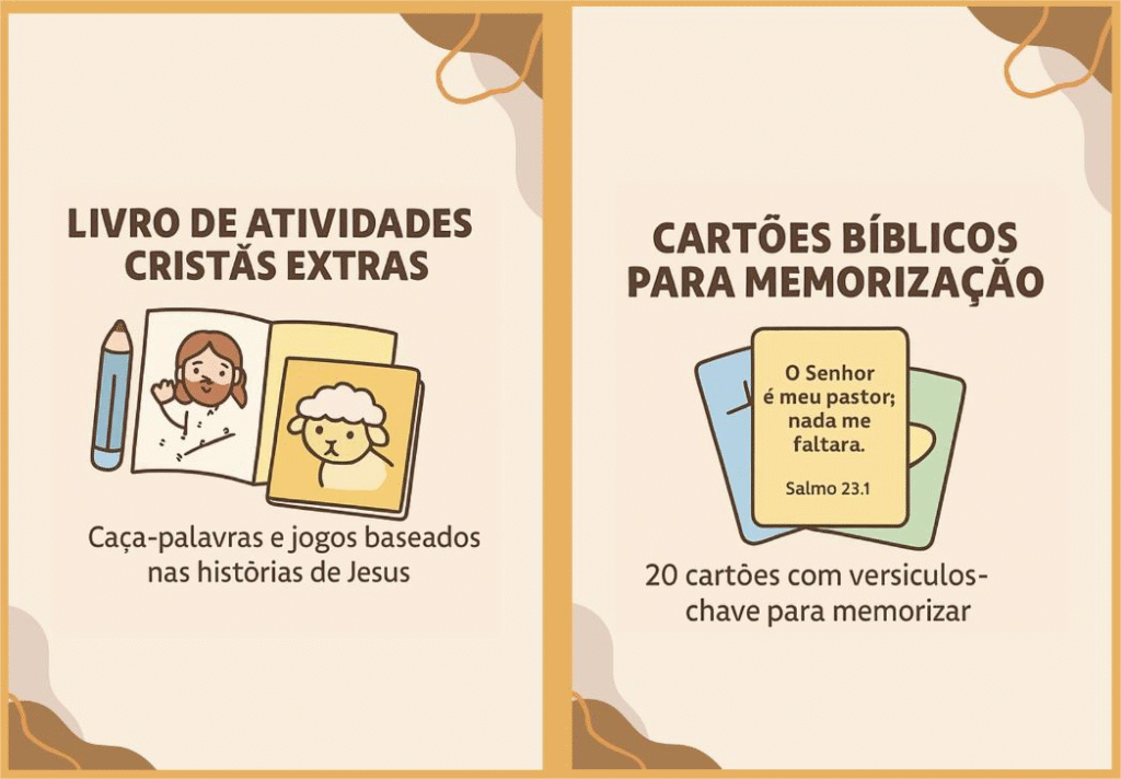 Estimula a curiosidade das crianças , tornando a fé algo divertido e fácil de entender, ajudando-as a se conectar com Deus de uma maneira leve e acessível.